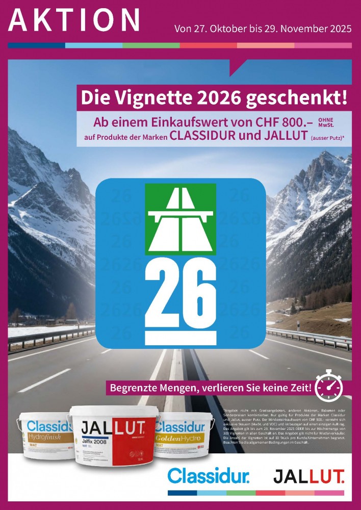 Vom 27. Oktober bis 29. November 2025, erhalten Sie beim Kauf von CHF 800.– exkl. MwSt. an Produkten der Marken CLASSIDUR und JALLUT (ausgenommen Putze) Ihre Gratisvignette.