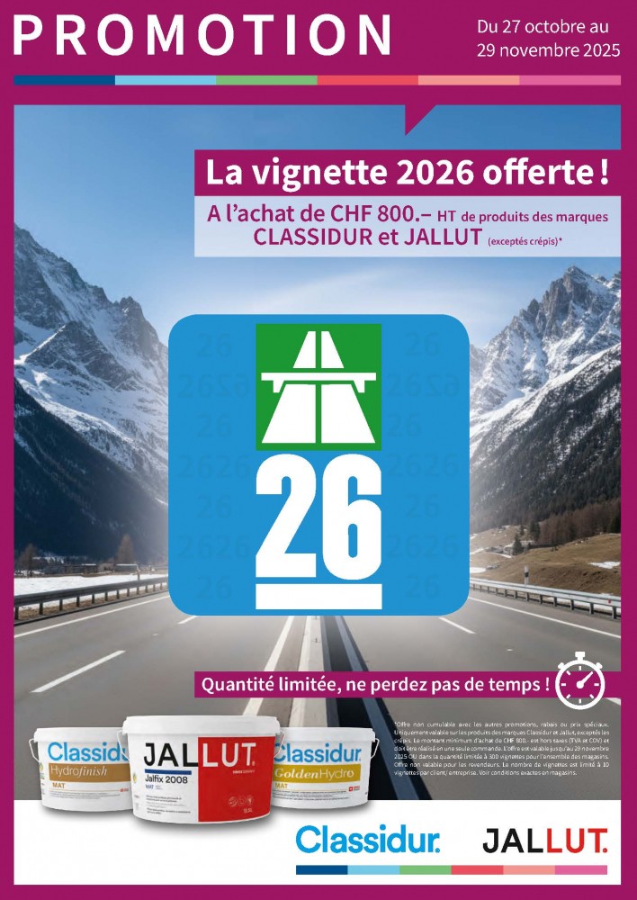 Du 27 octobre au 29 novembre 2025, à l’achat de CHF 800.– HT de produits des marques CLASSIDUR et JALLUT (exceptés crépis), recevez votre vignette gratuite.