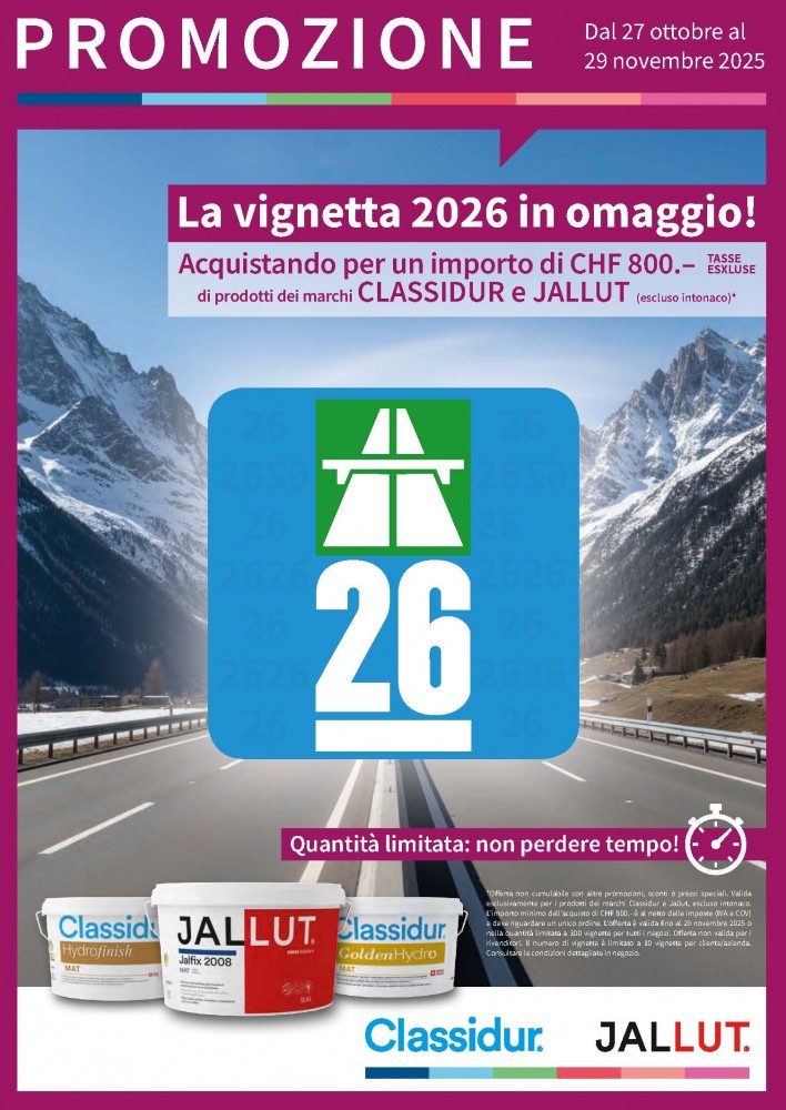 Dal 27 ottobre al 29 novembre 2025, ricevete la vostra vignetta autostradale gratuita con l'acquisto di 800 CHF più IVA di prodotti a marchio CLASSIDUR e JALLUT (escluso intonaco).